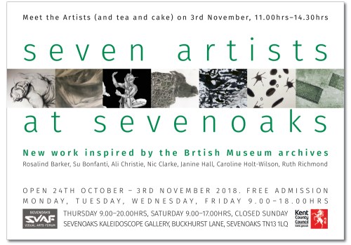 Our first group show was held in October 2018 at the Kaleidoscope Gallery in Sevenoaks, showcasing new work inspired by our regular visits to the British Museum Prints and Drawings Department. Read more about our sources of inspiration on the Sevenoaks Visual Arts Forum site here.